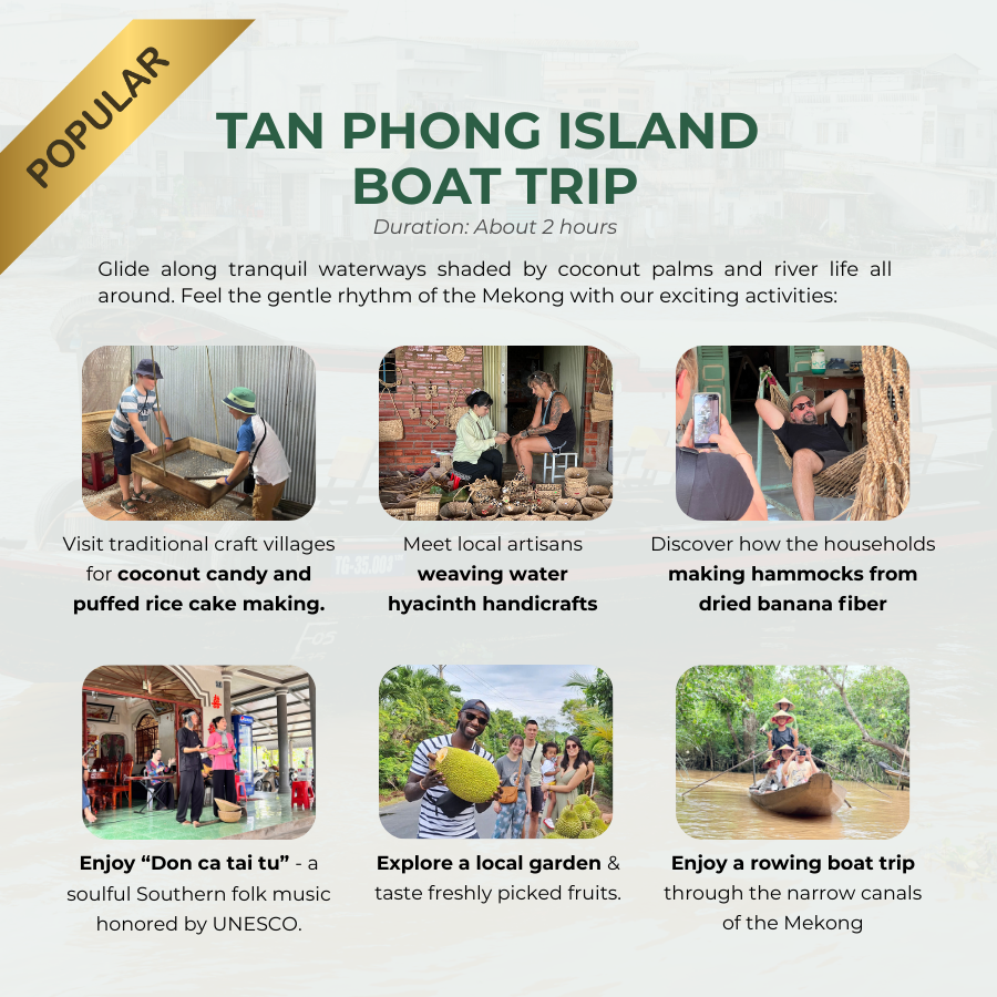 Tan Phong Island is a tranquil island in the Mekong Delta, famous for its fruit gardens and traditional village life. A boat trip through its peaceful canals allows visitors to discover local handicrafts, taste fresh tropical fruits, and experience the authentic culture of the Mekong.