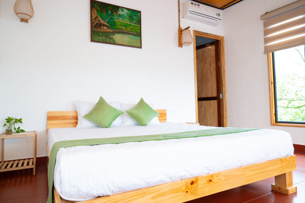 Our Double Room is designed for couples or solo travelers seeking a calm and comfortable stay. Featuring a cozy queen bed, the space feels warm and airy, reflecting the gentle rhythm of life in the Mekong Delta.